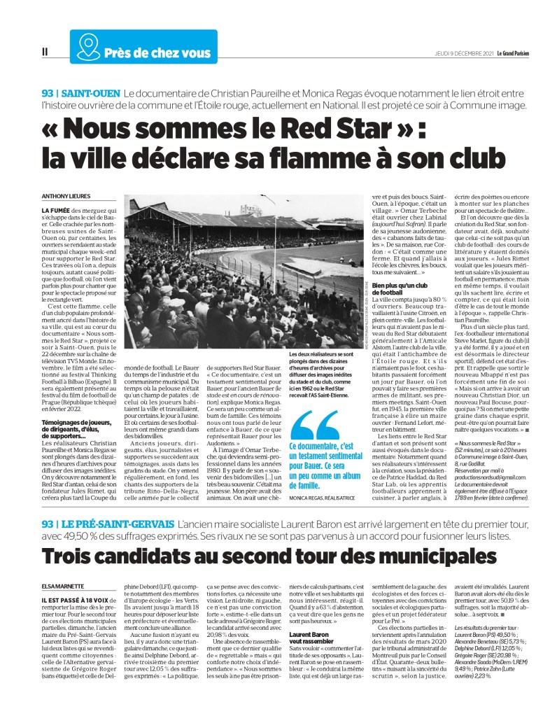 Le stade Bauer, qui est devenu au fil du montage, en quelque sorte, notre protagoniste principal, est en train d’être détruit et reconstruit. Le film devient ainsi une sorte de testament de ce lieu qui a vu vibrer tant de générations de supporters, mais aussi tant de militants lors de grands meetings politiques ou tant d’habitants de Saint-Ouen lors des célébrations municipales…